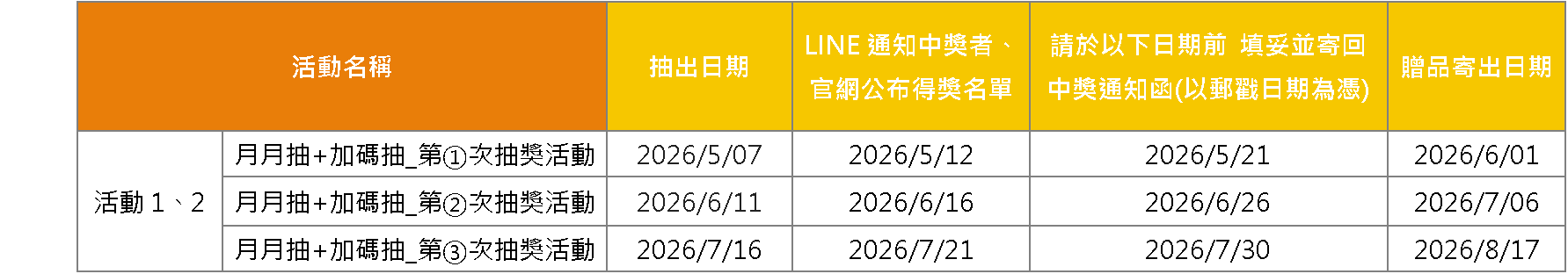 • 抽獎得獎公布及獎項寄出時程如下: