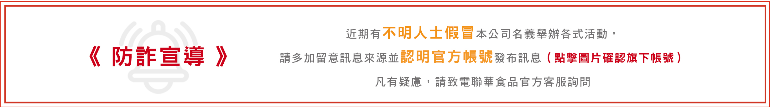 1. 近期有不明人士假冒聯華食品工業股份有限公司之名義舉辦各式活動,請多加留意訊息來源,並認明官方帳號發布訊息