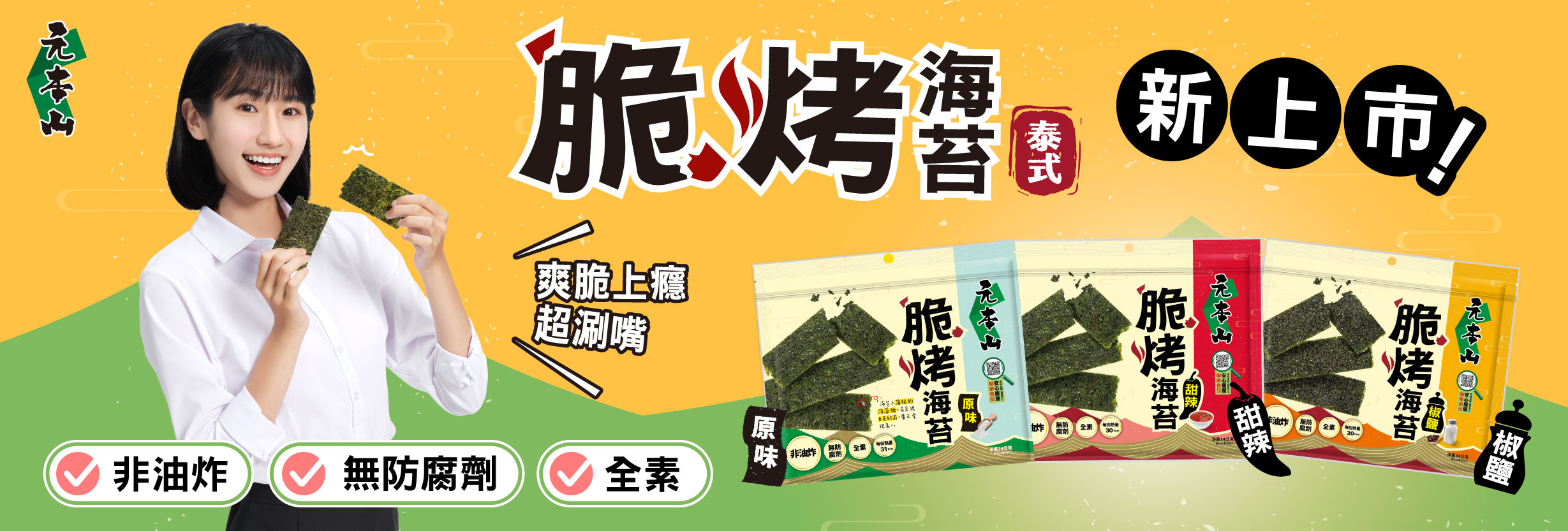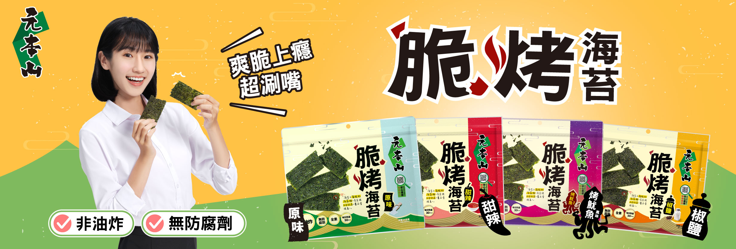 海苔原料從海中採收後,先將海苔乾燥,製成一片一片的大張海苔;挑出品質好、顏色翠綠、完整無破洞且透光度佳的高品質海苔原料,進入元本山的工廠之後,會經過烘培、調味,最後經過裁切及包裝,大家常見的元本山海苔就大功告成了!元本山海苔在1990年時通過了政府的優良食品規範認證(GMP),品質有國家保證,吃起來當然更放心!