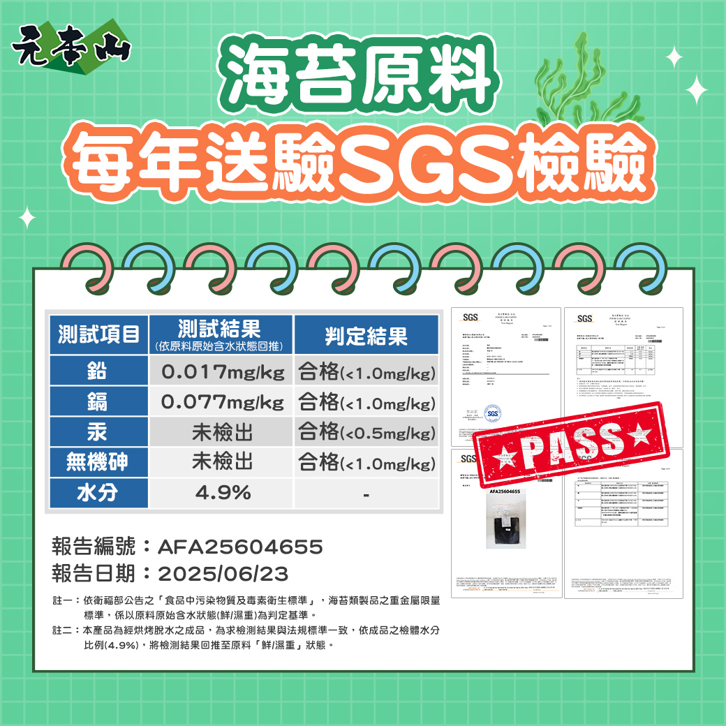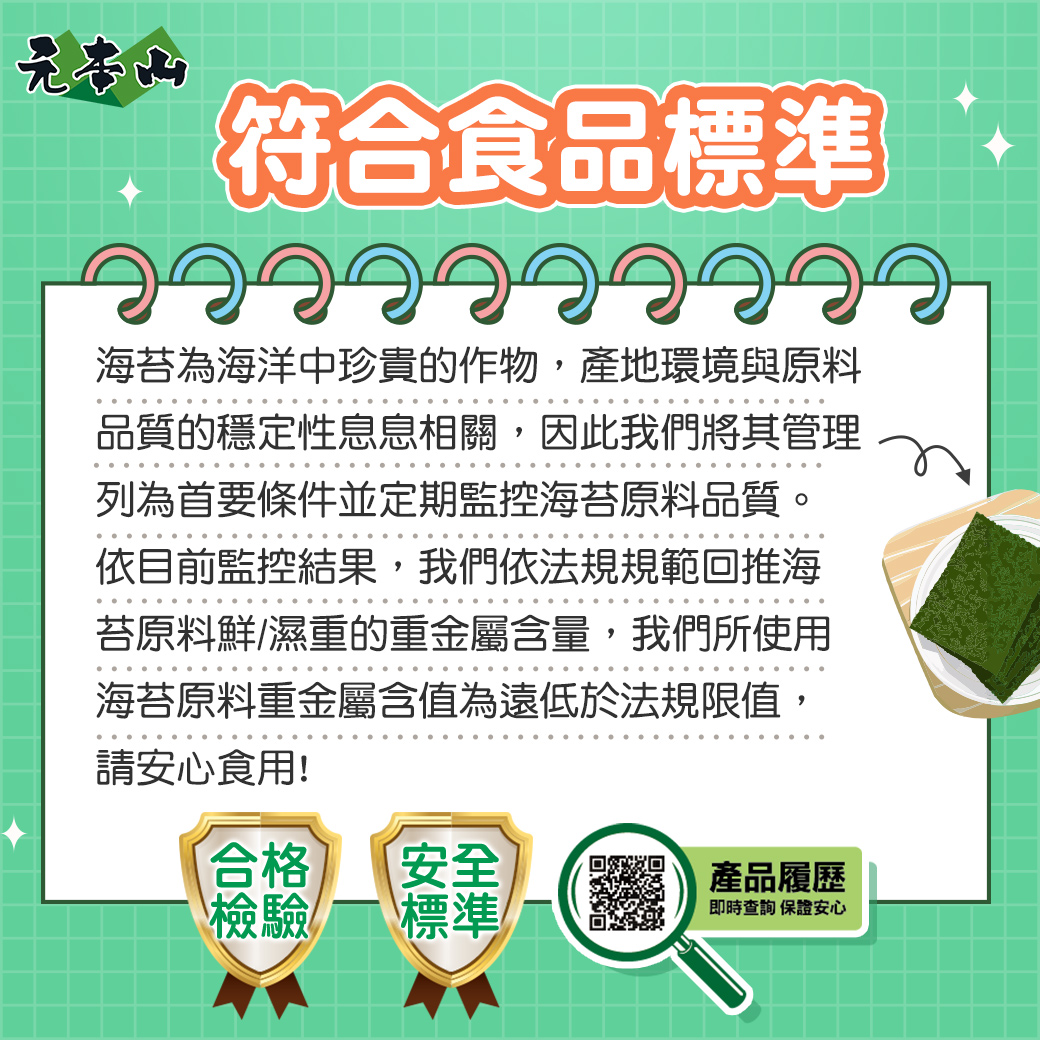 海苔原料從海中採收後,先將海苔乾燥,製成一片一片的大張海苔;挑出品質好、顏色翠綠、完整無破洞且透光度佳的高品質海苔原料,進入元本山的工廠之後,會經過烘培、調味,最後經過裁切及包裝,大家常見的元本山海苔就大功告成了!元本山海苔在1990年時通過了政府的優良食品規範認證(GMP),品質有國家保證,吃起來當然更放心!